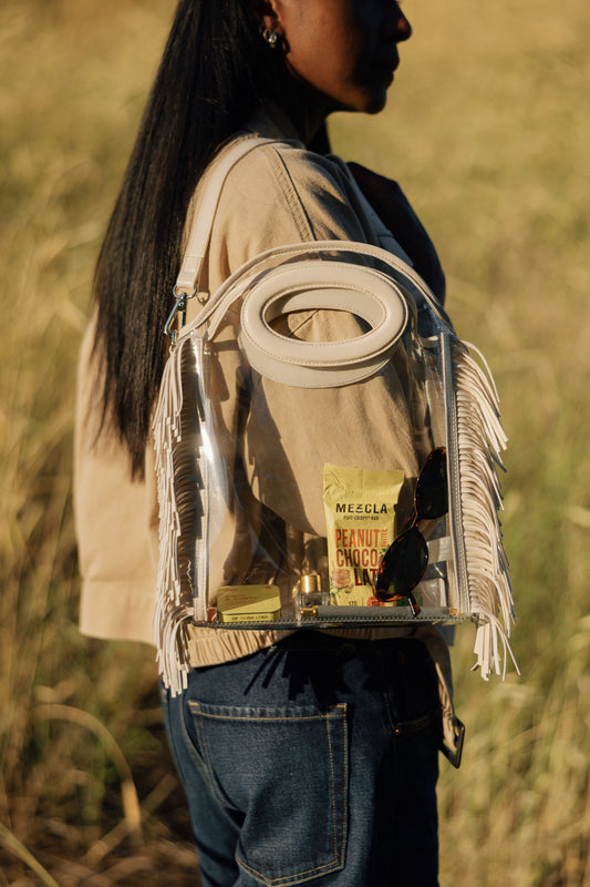Clear bags are a must have for concerts and this bag is actually fashionable! I love the fringe and crossbody. It's small and holds the essentials - phone, credit card, keys, and chapstick.